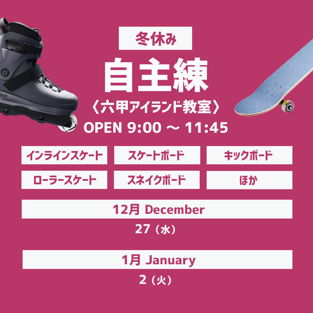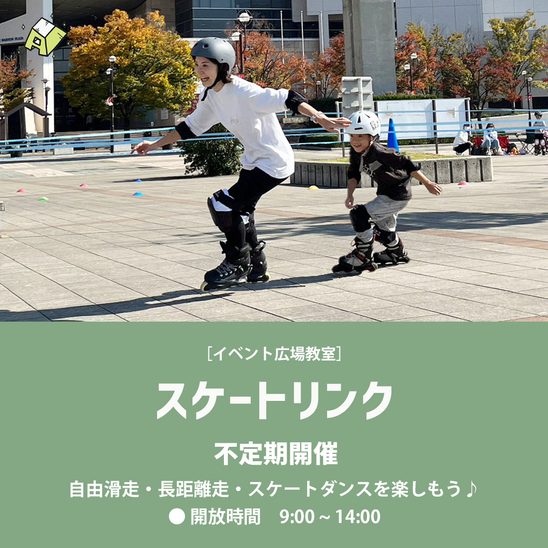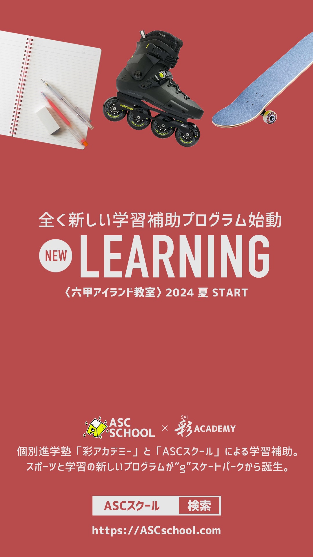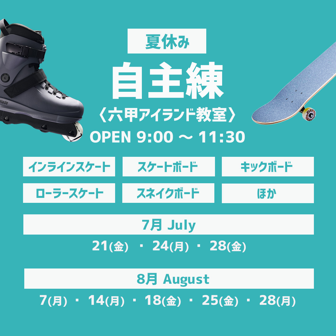 六甲アイランドのアイランドセンター駅を下車すると目の前に「イベント広場」が広がります。ここの広い敷地を活かして、"スケートクロス"などに特化したASCスクールの特別なプログラムを楽しんでいただけます。