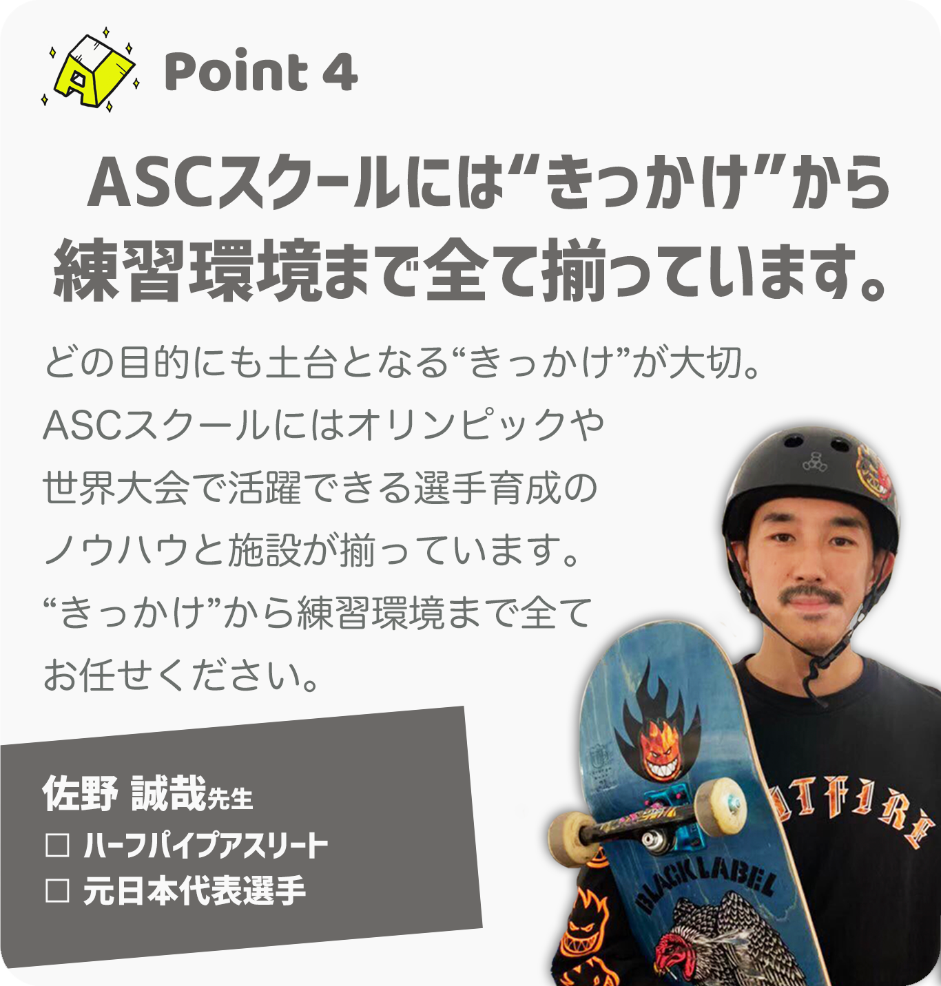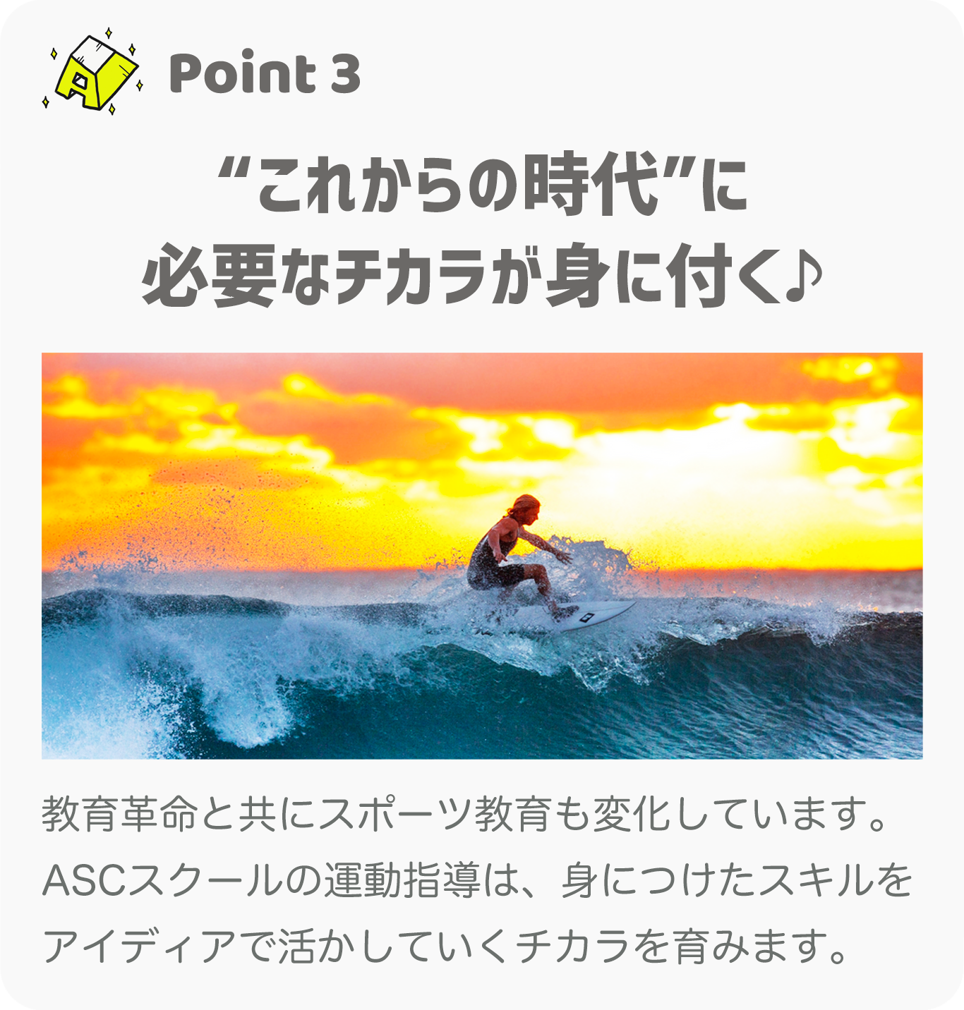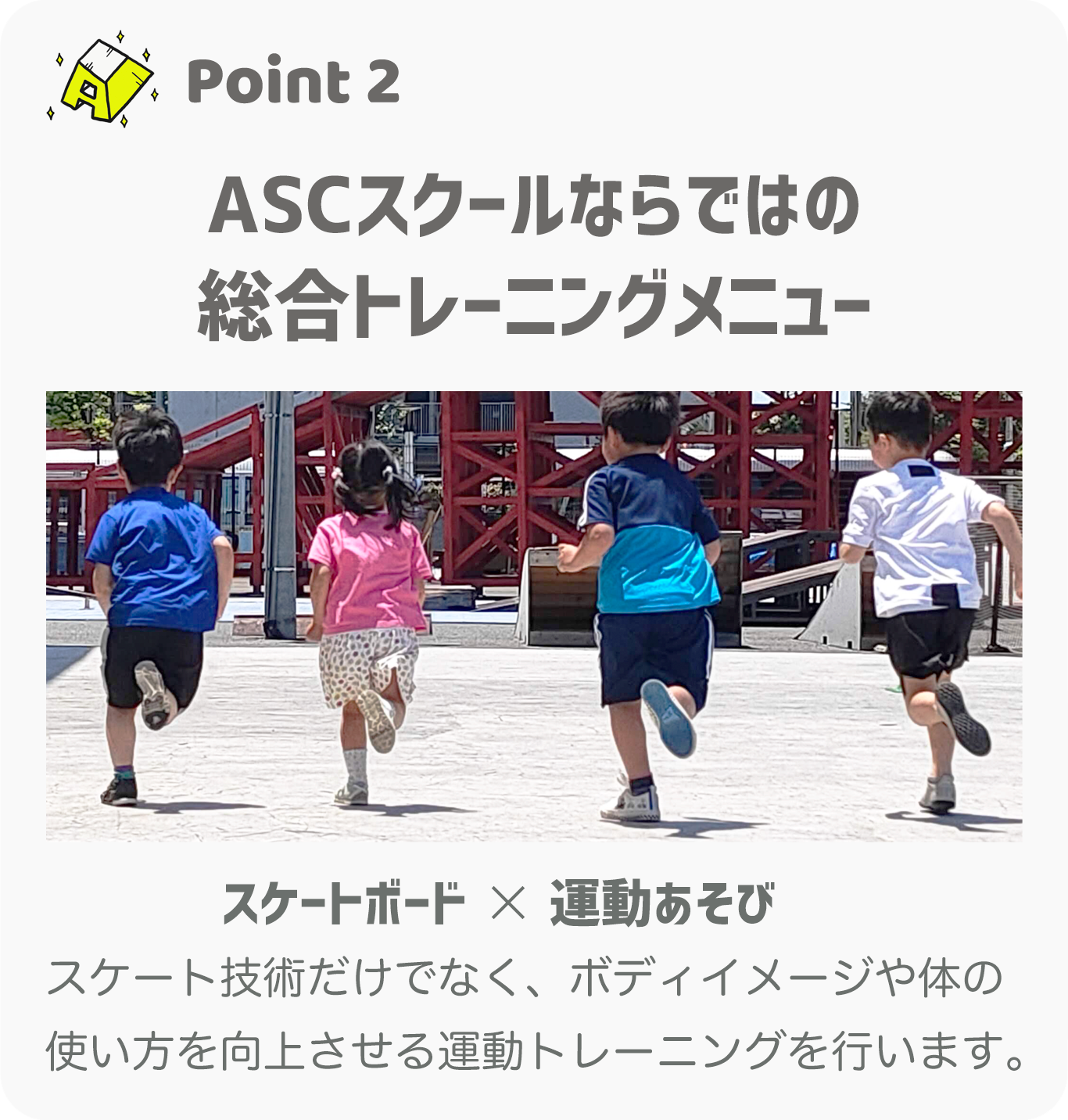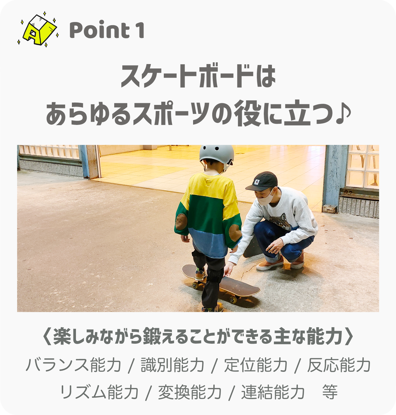 スケートボードの扱いを通して主に「識別能力・反応能力・バランス能力」を伸ばし、体育授業にも役立つトレーニングを行います。