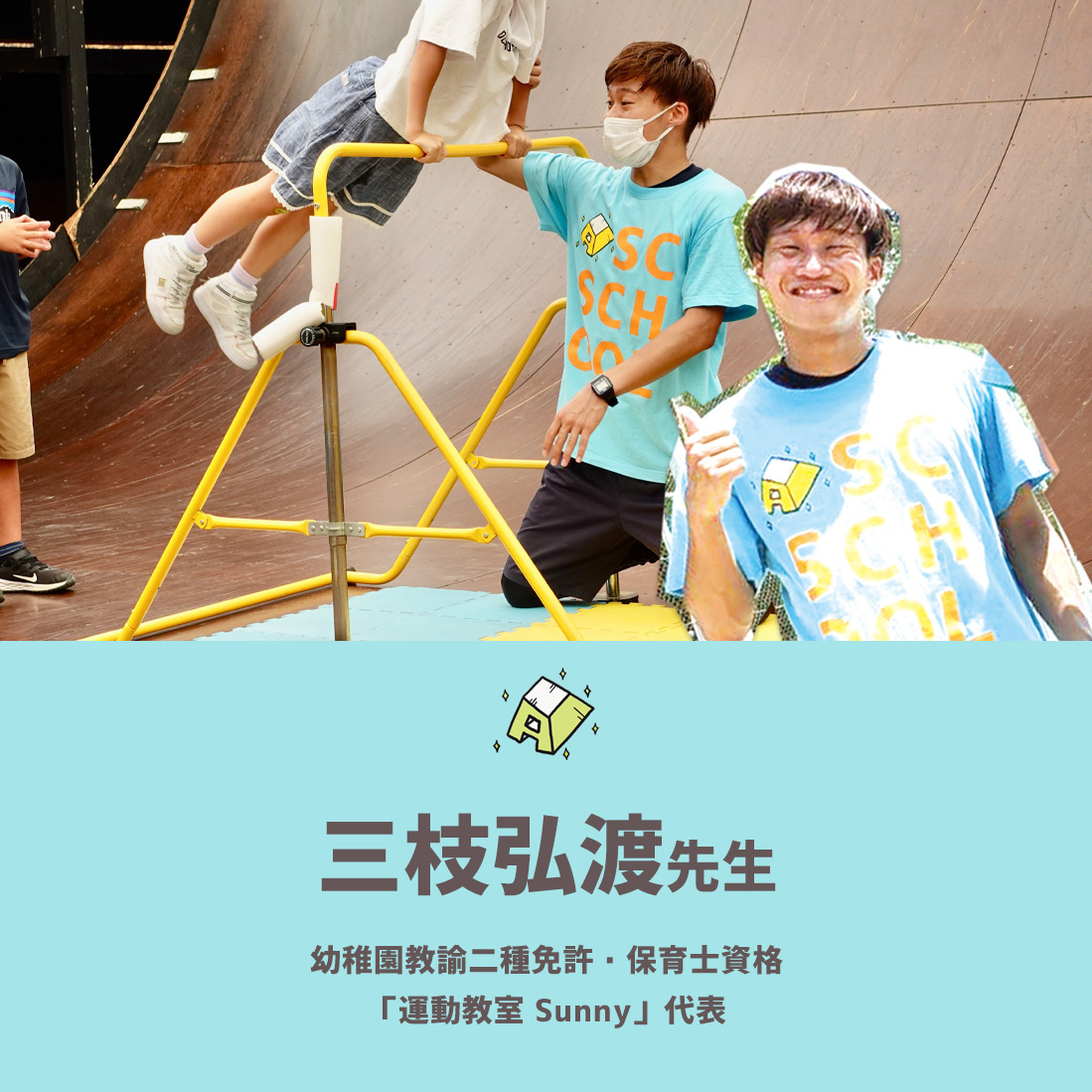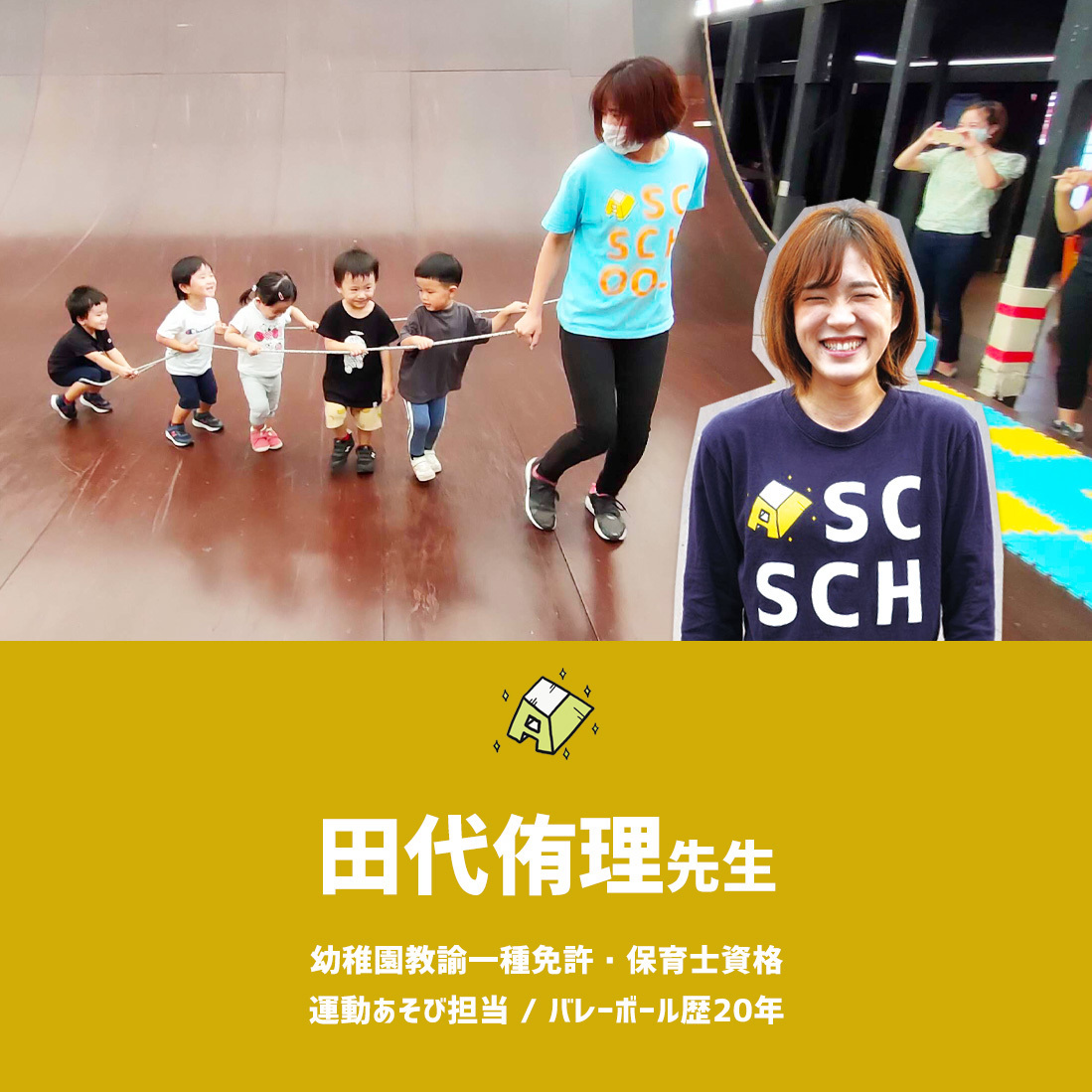いつも明るく優しい侑理先生は、子どもたちと遊ぶときはパワー全開!確かな知識と経験で、これまでにもたくさんの子どもたちを「スポーツ好き」に変身させてきました。保護者の皆様も子どもたちの変化を見て一緒にワクワクできますよ!運動あそび担当。