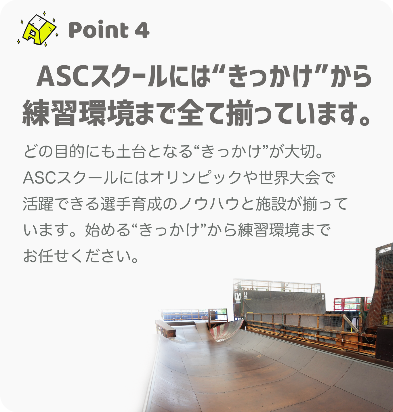 スケートパークにあるセクション(坂やハーフパイプなど)の楽しみ方をはじめ、施設のルールやマナーが学べるクラスです。ボードの基本動作(乗り方 / 進み方(プッシュ) / チクタク)を取得した方が対象となります。