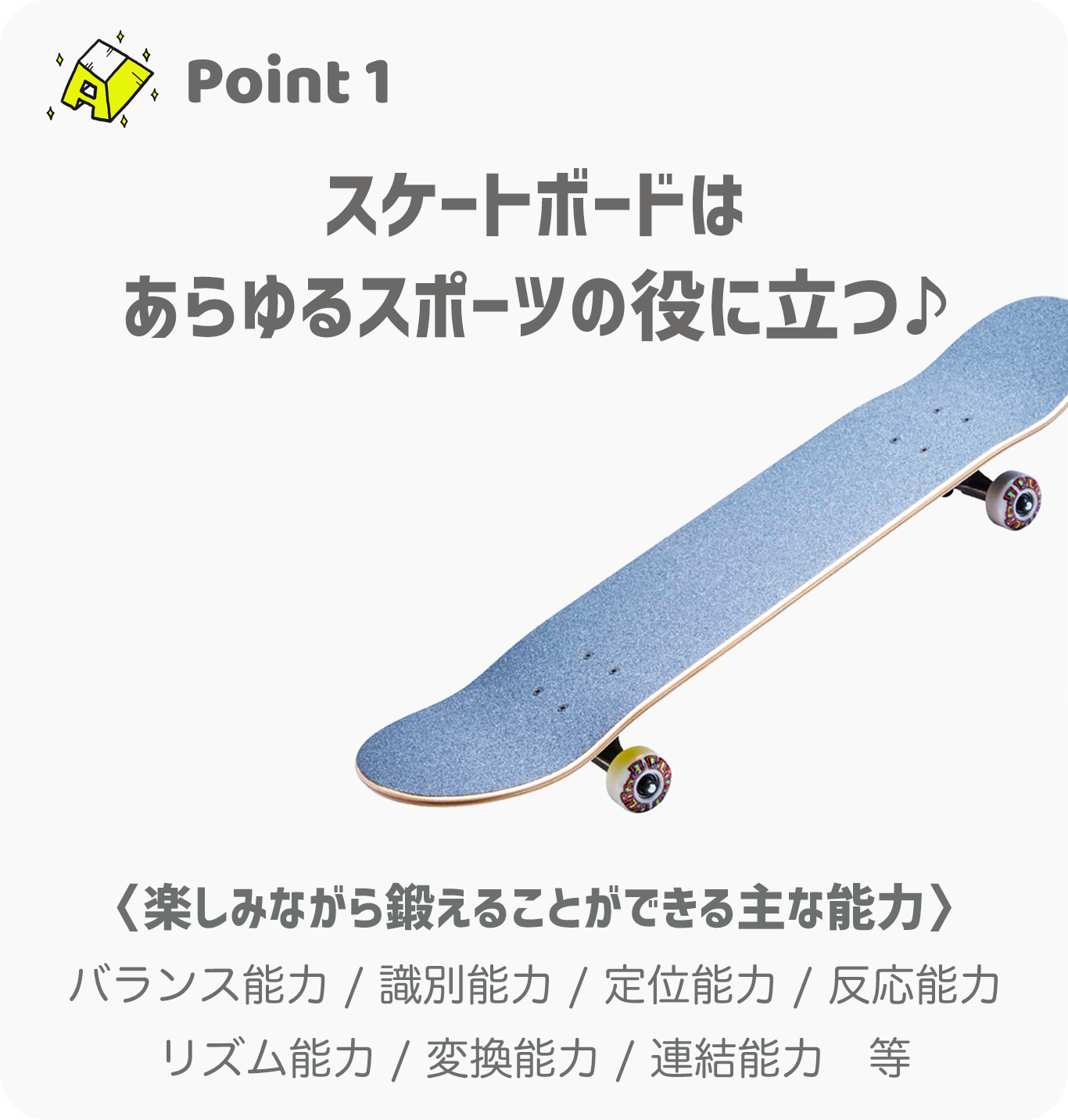 スケートボードの扱いを通して主に「識別能力・反応能力・バランス能力」を伸ばし、体育授業にも役立つトレーニングを行います。