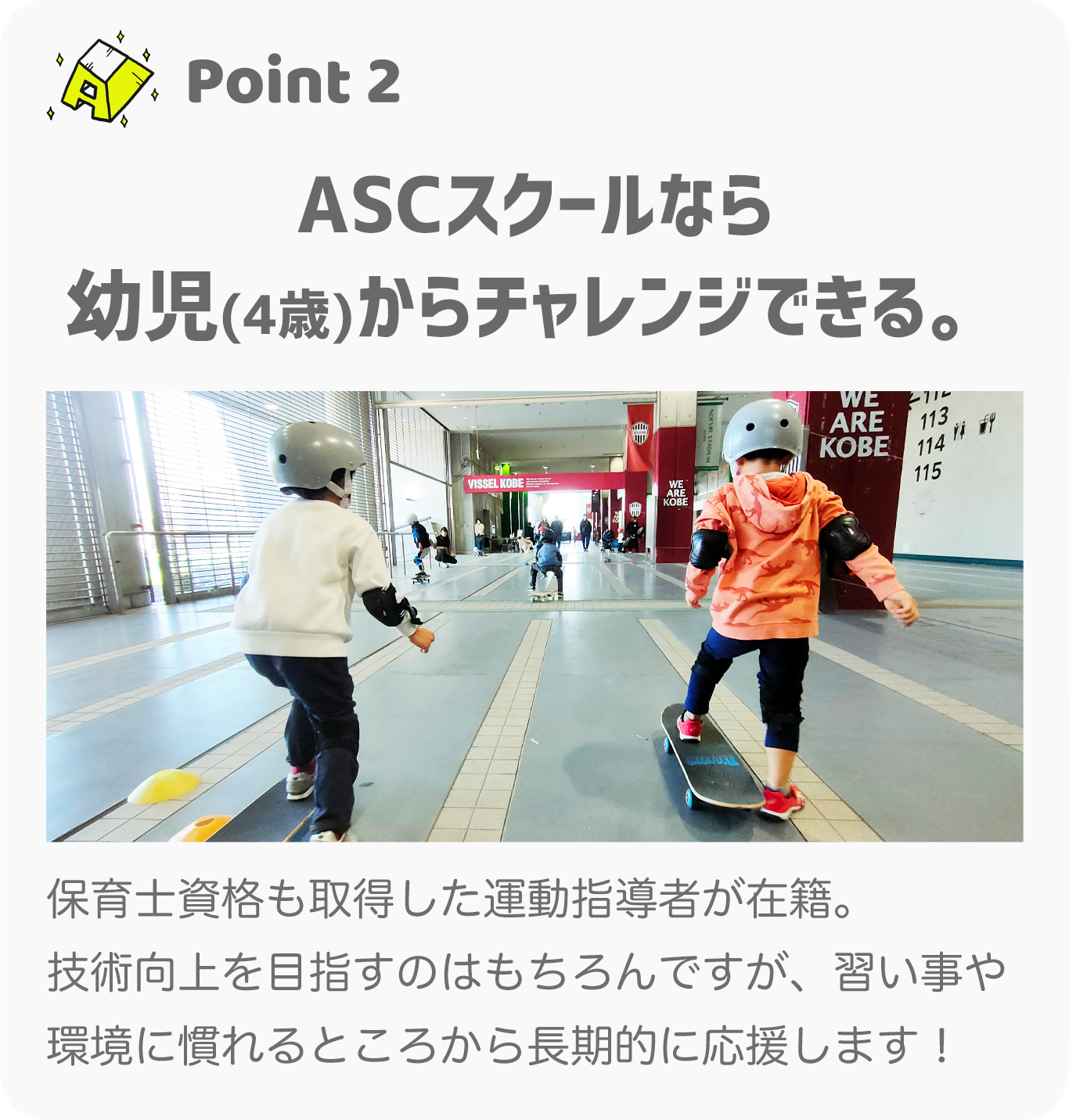スケートボードのスキルアップはもちろん、楽しい幼児向けのコーディネーショントレーニングも取り入れて行うクラスです。