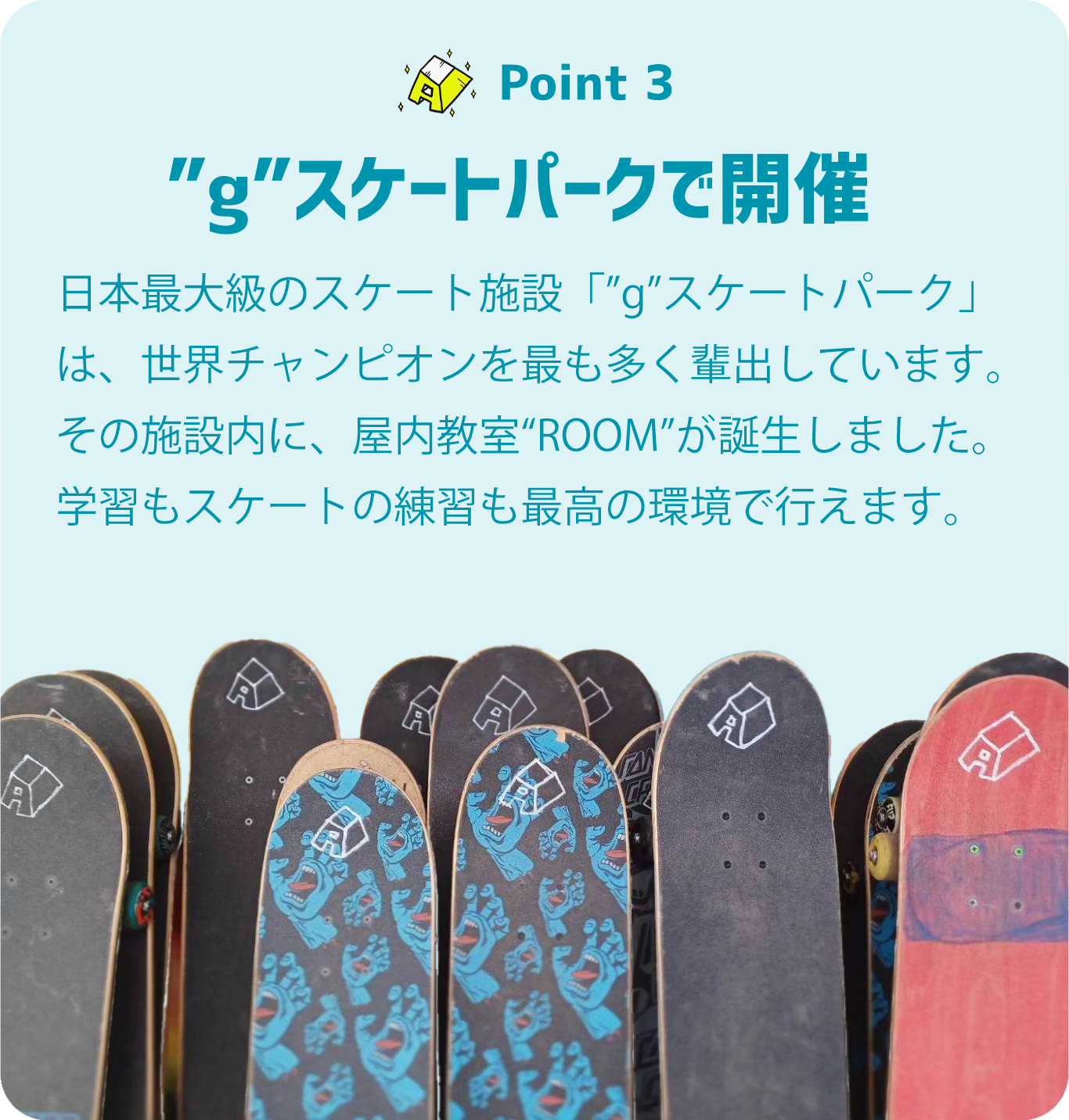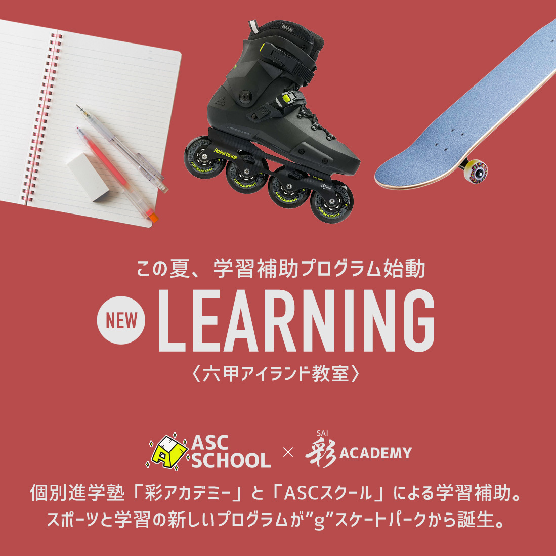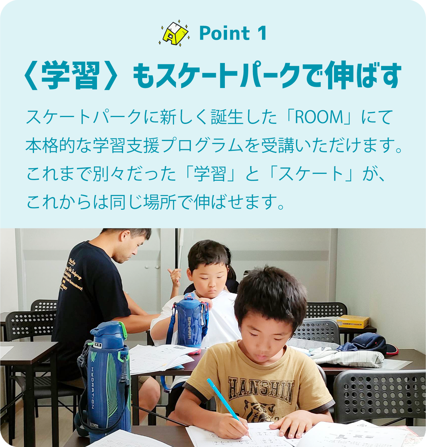 先生たちが見守る中、仲間たちと共に時間割に沿って"宿題"( ホームワーク)や学習ドリルを大好きな"スケートパーク"ですすめられます。また、学習のあとは練習時間をしっかりと確保。ASCスクールの学習プログラムなら、学習もスケートも同じ場所で両立させることができます。「PARK WORK」でワクワクしよう!